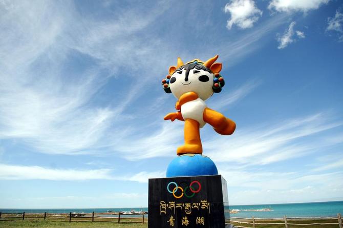 2008年6月22日,青海湖畔的“福娃迎迎”的塑像。新華社記者任曉剛攝