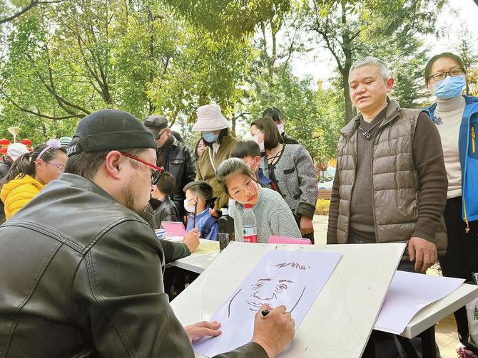 春城晚報(bào)記者江洋現(xiàn)場(chǎng)為市民畫肖像漫畫