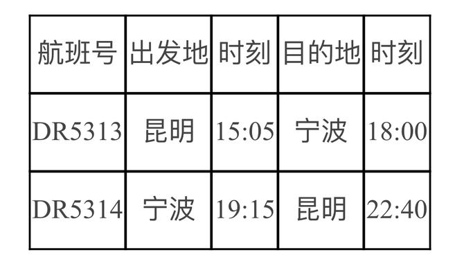 據(jù)了解,“昆明=寧波”航班班期計(jì)劃為每周一、三、五、七執(zhí)飛,航班信息如下: