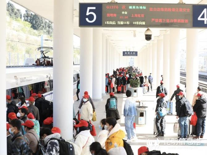 昆明信息港訊 記者上官艷君 2月10日11時14分,昆明開往上海的G1376次列車緩緩駛出曲靖北站,載著來自曲靖市沾益區(qū)11個鄉(xiāng)鎮(zhèn)(街道)的800余名務(wù)工團(tuán)體旅客,再次奔赴紅火的一年。