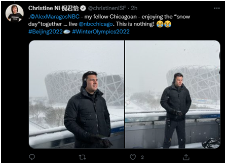 13日,美國全國廣播公司(NBC)華裔記者倪君怡發(fā)布了他們在鳥巢附近現(xiàn)場報道的情況,并配文稱自己的同事很享受這個“大雪天氣”?!?/p>