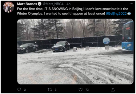 贊嘆雪景的還有美國全國廣播公司(NBC)主持人馬特·巴恩斯,不過他自稱似乎不太喜歡下雪天,但他仍發(fā)文表示:“(我來的)第一次,北京下起了雪!我不太喜歡下雪,但這是冬奧會啊。我想至少看到一次!”↓