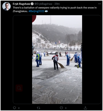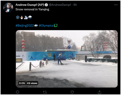 還有一些外媒記者關(guān)注到這場雪下得不小,很多工作人員在辛勤清掃。美聯(lián)社體育頻道記者安德魯·丹普夫就發(fā)了一段視頻,配文稱:“在延慶的降雪清理(工作)?!薄?/p>