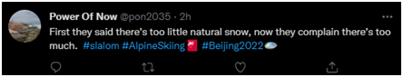 對于有人挑刺的舉動,一位網(wǎng)友在“#北京2022”話題上發(fā)文諷刺,意味深長:“一開始他們說天然雪太少了,現(xiàn)在他們又抱怨太多了?!薄?/p>