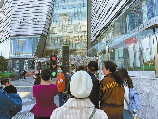 也有很多情侶來(lái)到現(xiàn)場(chǎng)打卡。韓女士告訴記者,“2·14”是個(gè)比較有意義的日子,特地和男朋友穿著情侶裝出來(lái)?!斑@里的‘愛(ài)心紅綠燈’很浪漫,過(guò)來(lái)拍幾張情侶照?!?/p>