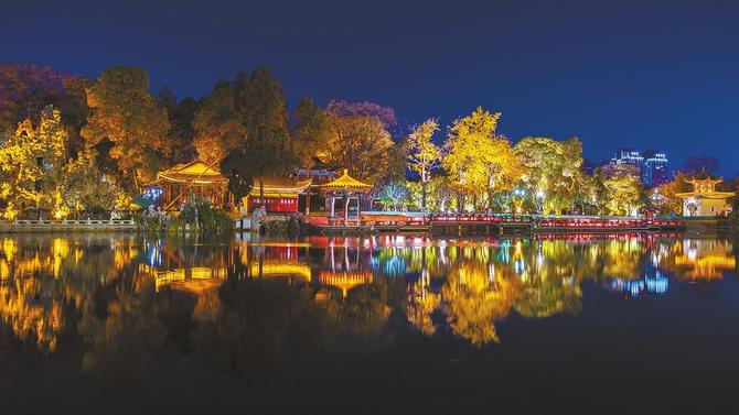 據(jù)悉,大觀公園打造了“流光溢彩夜大觀”的景致。全新升級的夜景燈光秀,等待游客前來觀賞——栩栩如生的紗幕投影、鳥鳴伴流水的彩云崖洞天、用腳能踩出十二生肖小動物的互動投影秀、在奔跑中感受海浪流動的沙灘、浪漫到冒泡的愛戀廣場……璀璨的燈光將點亮大觀公園,美輪美奐。(春城晚報 記者左學(xué)佳)