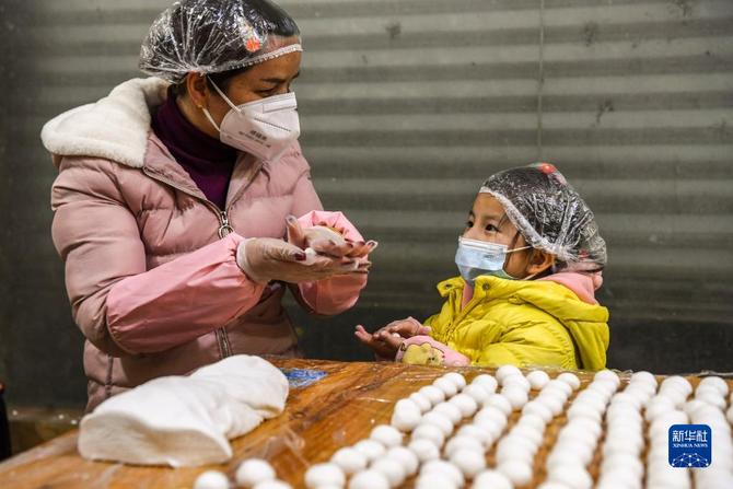 2月14日,廣西德??h城關(guān)鎮(zhèn)蓮城社區(qū)居民黃榮算(左)與女兒一起制作手工湯圓。新華社記者 曹祎銘 攝