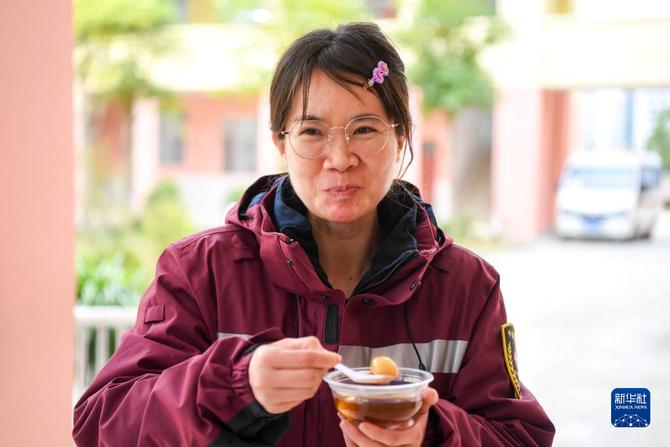 2月15日,流調(diào)隊員姚雪婷在吃廣西德保縣城關(guān)鎮(zhèn)蓮城社區(qū)居民制作的手工湯圓。新華社記者 曹祎銘 攝