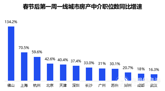 數(shù)據(jù)顯示,節(jié)后開工第一周,房地產(chǎn)行業(yè)招聘職位數(shù)同比減少29%,降幅高于全行業(yè)的4.5%。不過(guò),房產(chǎn)中介職位數(shù)同比增速達(dá)到14.2%,其中,一線城市房產(chǎn)中介職位數(shù)同比增速達(dá)到44.1%,高于新一線、二線、三線及以下等級(jí)城市。在一線城市中,佛山房產(chǎn)中介招聘職位數(shù)同比增長(zhǎng)134.2%,增速位居第一。其次是上海和杭州,同比分別增長(zhǎng)70.5%、59.6%。