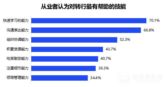 談及轉(zhuǎn)入新行業(yè)的阻礙,67.6%的房地產(chǎn)從業(yè)者表示可能“缺乏新的行業(yè)經(jīng)驗(yàn)”,52.1%的從業(yè)者表示“新行業(yè)的知識(shí)技能不足”,46.3%的從業(yè)者表示會(huì)“缺少人脈資源”,45.3%的從業(yè)者表示“迷茫,沒(méi)想好進(jìn)入哪一行”。70.1%的從業(yè)者認(rèn)為,快速學(xué)習(xí)能力對(duì)轉(zhuǎn)行有幫助,66.8%和52.3%的從業(yè)者認(rèn)為,溝通表達(dá)能力、組織協(xié)調(diào)能力最有作用。
