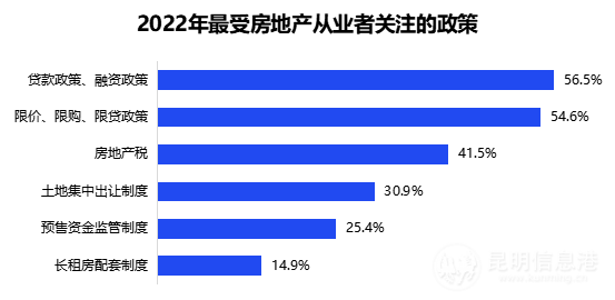 56.5%的房地產(chǎn)從業(yè)者關(guān)心貸款、融資政策,54.6%的從業(yè)者關(guān)心限價(jià)、限購(gòu)、限貸政策,41.5%的從業(yè)者關(guān)心房地產(chǎn)稅,而關(guān)心土地出讓、資金監(jiān)管、長(zhǎng)租房配套等政策的從業(yè)者分別占30.9%、25.4%和14.9%。對(duì)于呼之欲出的房產(chǎn)稅,51.3%的房地產(chǎn)從業(yè)者認(rèn)為,這一政策可能使低線城市房地產(chǎn)行業(yè)更難;也有32.7%的從業(yè)者認(rèn)為,一線、新一線城市房地產(chǎn)行業(yè)就業(yè)仍然看好;36.8%的從業(yè)者認(rèn)為,二手房市場(chǎng)趨冷,房產(chǎn)中介發(fā)展受阻。