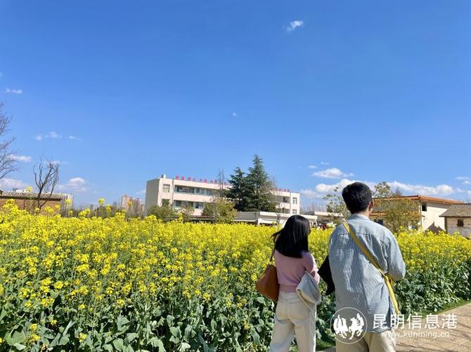 在花田間,熱情的游客、湛藍的天空、金黃的花海、充滿年代感的老房子等元素碰撞,組成一幅天然的油畫。這里還有一座烏龍鄉(xiāng)村圖書館,游客可以在這里休憩、閱讀、放空。住在呈貢區(qū)的李軍說:“最近看到網(wǎng)上烏龍古漁村油菜花開了,實在是太美了,就和家人一起來了?!睂iT從石林來的劉奶奶說,今天和老伴一起來的,互相還拍了很多美照。