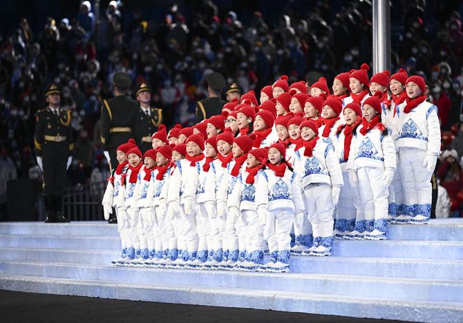 “閉幕式與開幕式總體上一脈相承,有不少‘熟悉的陌生人’。”張藝謀舉例說,在開幕式用希臘語演唱奧林匹克會(huì)歌的40多名河北阜平山區(qū)的孩子,在閉幕式現(xiàn)場再次登場表演。開幕式中,他們身著喜慶的紅色衣服,閉幕式上,則改穿青花瓷樣式的衣服,像一個(gè)個(gè)冰雪小精靈?!霸?jīng)生活在貧困山區(qū)的他們?nèi)缃癯晒γ撠?這既體現(xiàn)脫貧攻堅(jiān)的成果和共同富裕的決心,更表達(dá)冰雪冬奧‘更團(tuán)結(jié)’的主題。”
