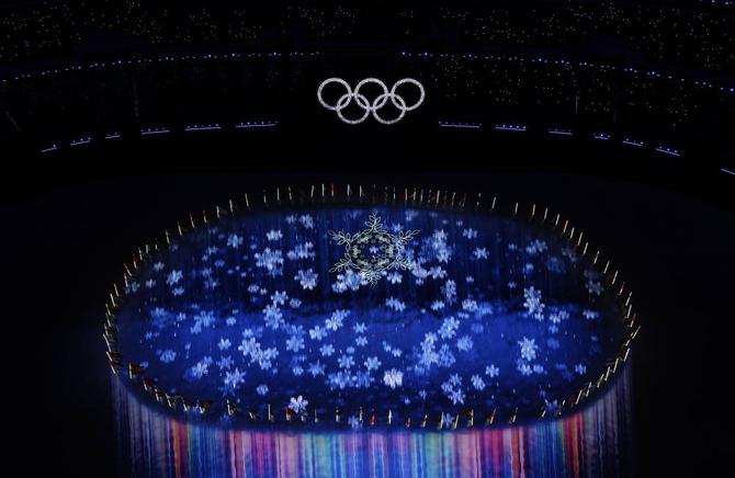 在奧運(yùn)圣火熄滅環(huán)節(jié),孩子們用純潔稚嫩的童聲再次唱響2008北京奧運(yùn)會(huì)經(jīng)典主題曲《我和你》,各參賽代表團(tuán)執(zhí)旗手向中央?yún)R聚?!按?008年北京奧運(yùn)會(huì)的星星五環(huán)升起,如此空靈浪漫,人們仿佛回到2008年那個(gè)神奇、振奮的夏日夜晚——就在當(dāng)時(shí),也就在此地!”張藝謀描述道,“與此同時(shí),雪花火炬緩緩落下,在空中與星星五環(huán)交錯(cuò)、對(duì)話,再次深情致敬2008北京奧運(yùn)會(huì)?!?/p>