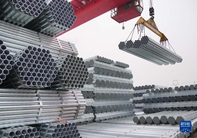 河北省遷安市一家鍍鋅管生產(chǎn)企業(yè)的工人操作機械設(shè)備吊運鋼管(2021年12月11日攝)。新華社記者 楊世堯 攝