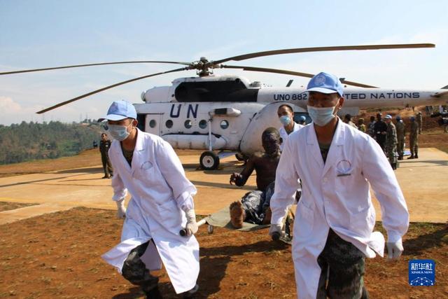 2010年7月3日,中國赴剛果(金)維和醫(yī)療分隊醫(yī)護人員在剛果(金)南基伍省布卡武機場運送油罐車爆炸中的受傷者。新華社發(fā)(郭云飛攝)
