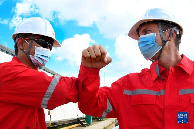 2020年11月27日,中國石油集團長城鉆探工程公司古巴項目GW91鉆井平臺中方員工(左)同古方員工互相致意。新華社發(fā)(華金·埃爾南德斯攝)