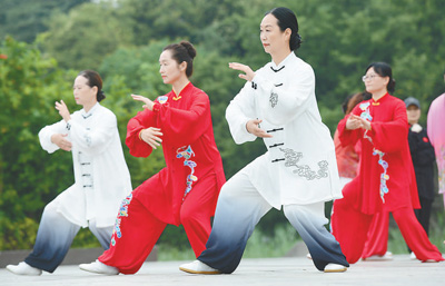 中老年人越來越注重健康生活,享受運(yùn)動(dòng)樂趣。圖為安徽省阜陽市的太極拳愛好者在公園內(nèi)練習(xí)太極拳。