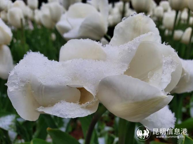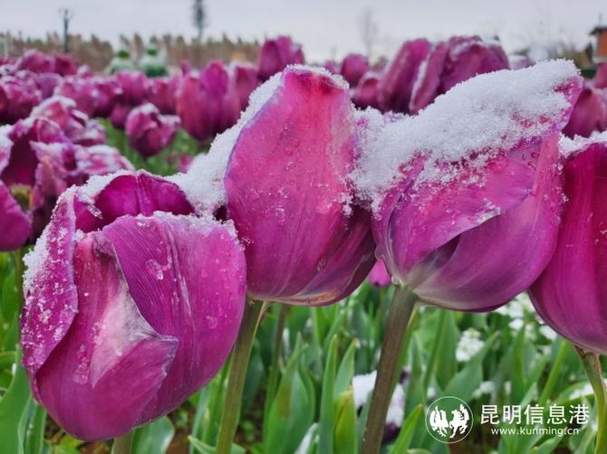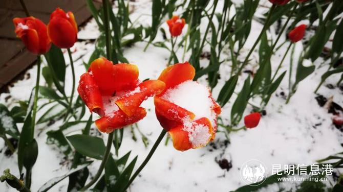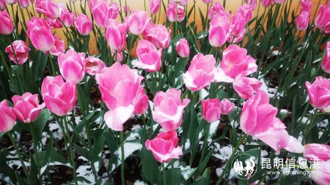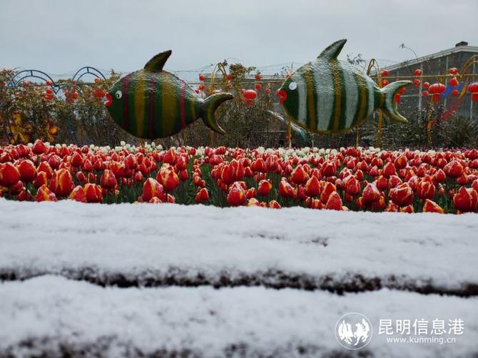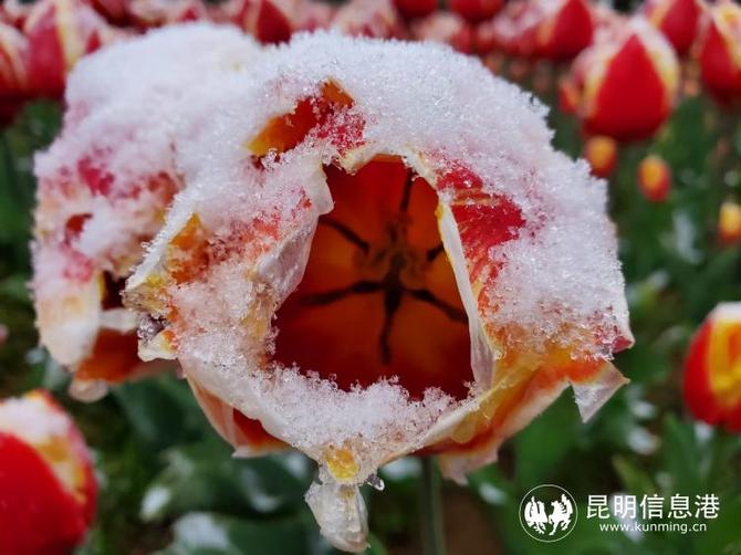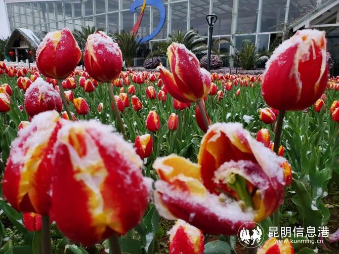 位于昆明滇池國家旅游度假區(qū)的撈漁河濕地公園內(nèi),郁金香在雪中綻放。