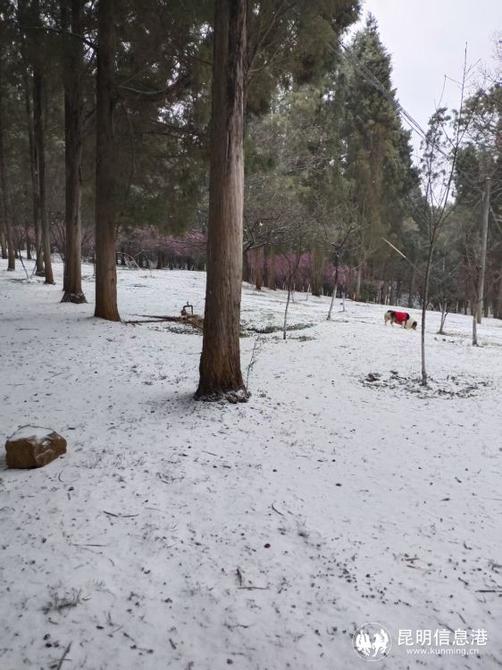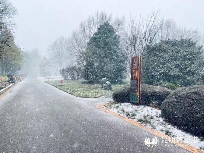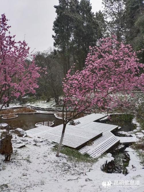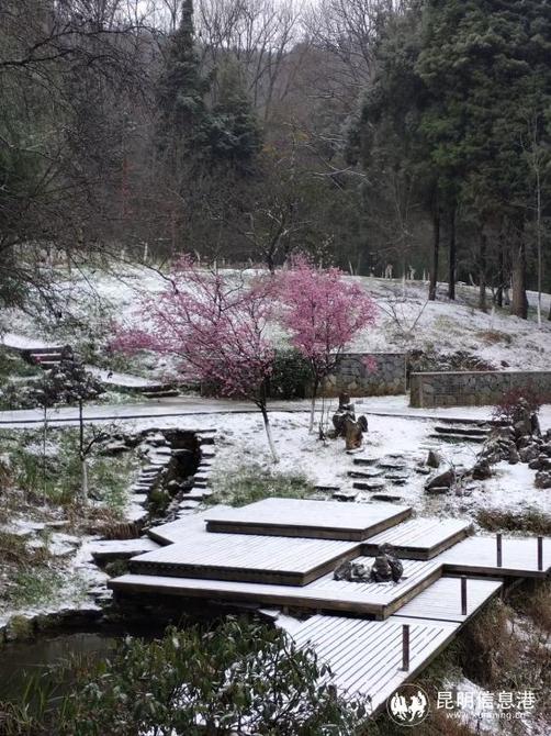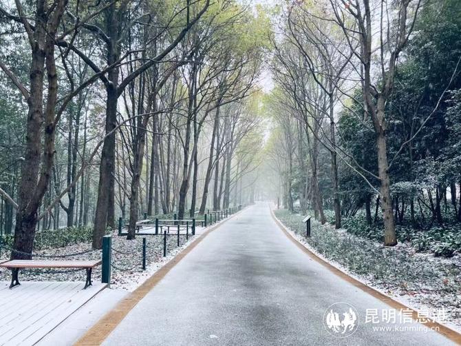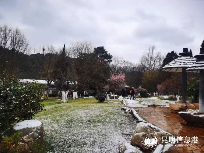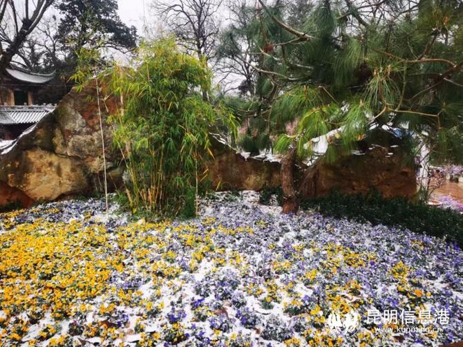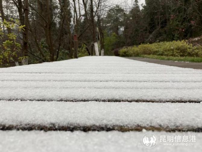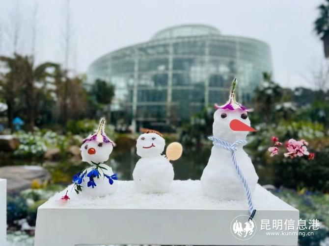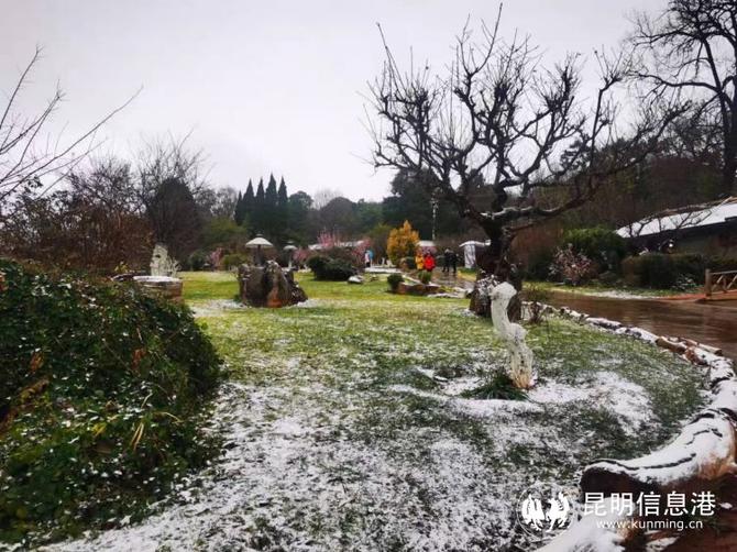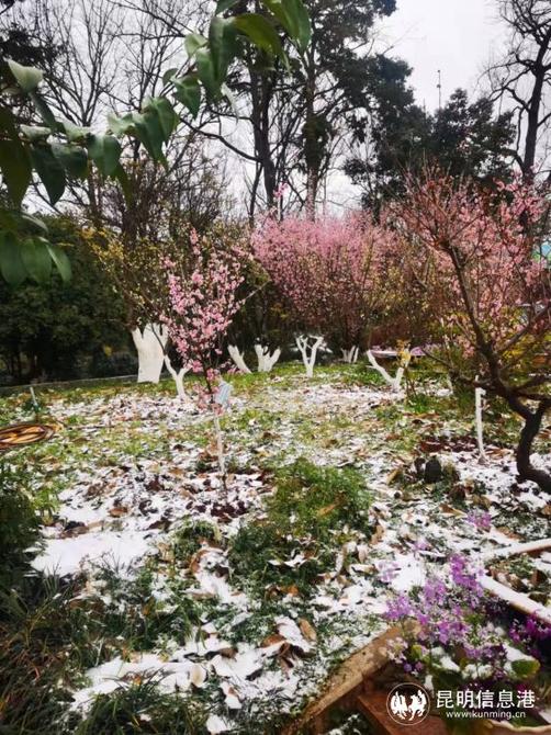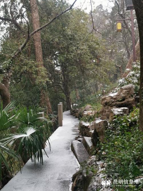 昆明植物園堆起積雪。