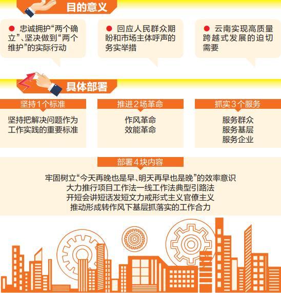 第三,這是云南實現(xiàn)高質(zhì)量跨越式發(fā)展的迫切需要。對于一個地方來說,既要持續(xù)抓好基礎(chǔ)設(shè)施“硬環(huán)境”,更要旗幟鮮明抓好“軟環(huán)境”建設(shè)。發(fā)展靠環(huán)境,環(huán)境靠作風(fēng),干部的作風(fēng)狀態(tài)很大程度上決定發(fā)展狀態(tài)。我省在推動高質(zhì)量跨越發(fā)展的征程中,發(fā)展不平衡不充分問題突出,支撐高質(zhì)量發(fā)展的基礎(chǔ)還不牢固,各種不確定性風(fēng)險和挑戰(zhàn)明確增多,加快發(fā)展的任務(wù)很重,發(fā)展的質(zhì)量和效益亟待提升。風(fēng)險越大、挑戰(zhàn)越多、任務(wù)越重,越要以好的作風(fēng)振奮精神、激發(fā)斗志、釋放活力、樹立形象、贏得民心,越要牢固樹立“今天再晚也是早,明天再早也是晚”的效率爭先意識,不等、不停、不看,理直氣壯、義不容辭、敢抓敢管、攻堅克難,以自我革命的精神破除思想積弊,以抓鐵有痕的力度改進工作作風(fēng),不斷補齊云南發(fā)展存在的各方面短板,辦好讓群眾有感的事情,提供讓企業(yè)滿意的服務(wù),增強云南發(fā)展的潛力和后勁。