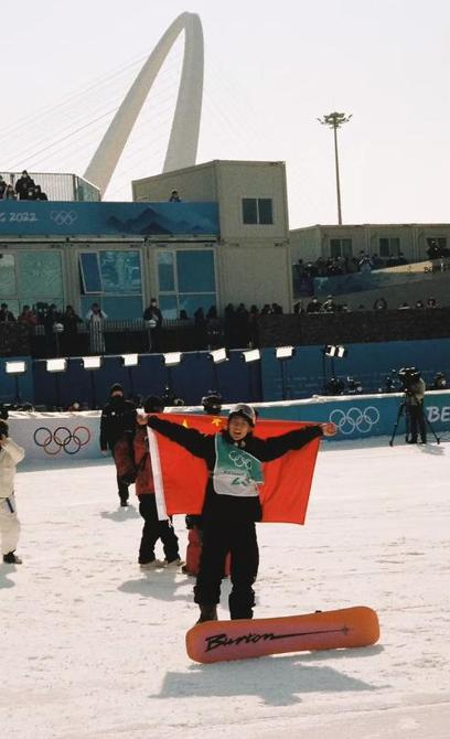 還有一張是蘇翊鳴笑容燦爛地張開(kāi)雙臂,身披中國(guó)國(guó)旗慶祝的照片。
