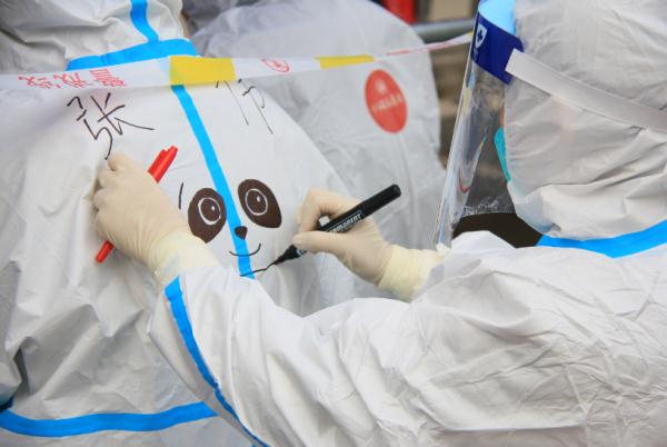來(lái)自鎮(zhèn)江的醫(yī)務(wù)人員王艷閑暇時(shí)喜歡畫(huà)畫(huà),采樣開(kāi)始前,她發(fā)揮特長(zhǎng),為“戰(zhàn)友”們繪就一幅幅活靈活現(xiàn)的“大白圖騰”,為緊張的采樣工作帶來(lái)了別樣歡樂(lè)。