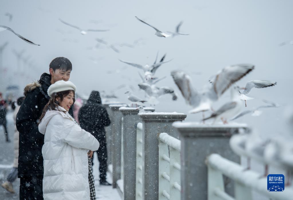 2月22日,市民冒雪在海埂大壩觀賞紅嘴鷗。當(dāng)日,春城昆明迎來(lái)降雪天氣。新華社記者 王冠森 攝