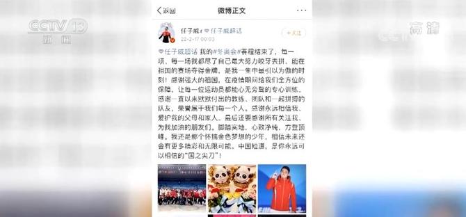 2月17日,任子威在社交媒體(微博)上寫道:“我的冬奧會賽程結(jié)束了,每一項、每一場我都盡了自己最大努力咬牙去拼,能在祖國的賽場奪得金牌,是我一生中最引以為傲的時刻!中國短道,是你永遠可以相信的‘國之尖刀’”!