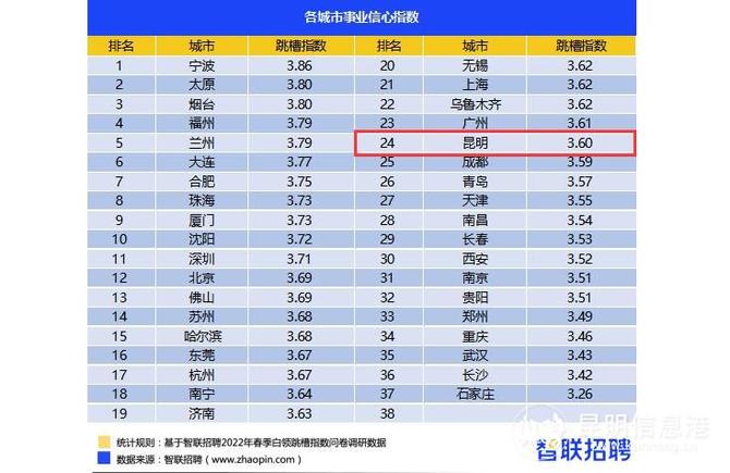 《智聯(lián)招聘2022年春季昆明白領(lǐng)跳槽指數(shù)調(diào)研報告》近日發(fā)布,其中指出,昆明地區(qū)有57.8%的受訪白領(lǐng)對2022年的事業(yè)取得成就懷抱信心,這個占比高于上一年的50.7%。信心指數(shù)雖然略低于全國平均水平3.61,但由去年春季的3.58,小幅提高至了3.6,在全國37個核心城市中排在第24位。