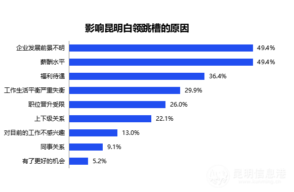 薪酬水平、企業(yè)發(fā)展前景不明是昆明白領(lǐng)跳槽的主要因素,占比均為49.4%。此外,福利待遇占比36.4%,職位晉升受限占比26%。昆明白領(lǐng)由于“上下級關(guān)系”而跳槽的占比,由上一年的13.3%上升到22.1%;由于“同事關(guān)系”而跳槽的占比,由上一年的1.7%上升到9.1%。分析認為,這體現(xiàn)出更多昆明白領(lǐng)希望獲得和諧的職場人際關(guān)系。