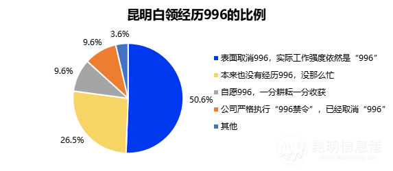 60.2%的受訪昆明白領(lǐng)過去一年經(jīng)歷“996”工作制,其中50.6%的昆明白領(lǐng)表示:“表面取消‘996’,實際的工作強度依然是‘996’?!痹谠撨x項上,全國平均占比為42.4%。也有9.6%的受訪昆明白領(lǐng)表示:“自愿‘996’,一分耕耘一分收獲?!痹谠撨x項上,全國平均占比為15.4%。