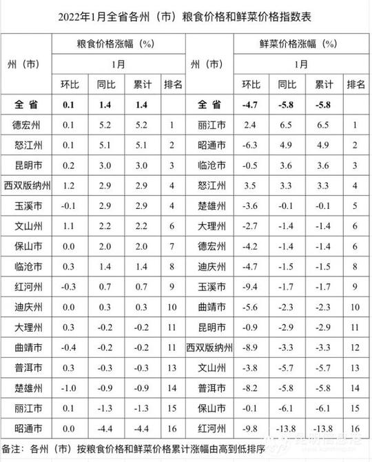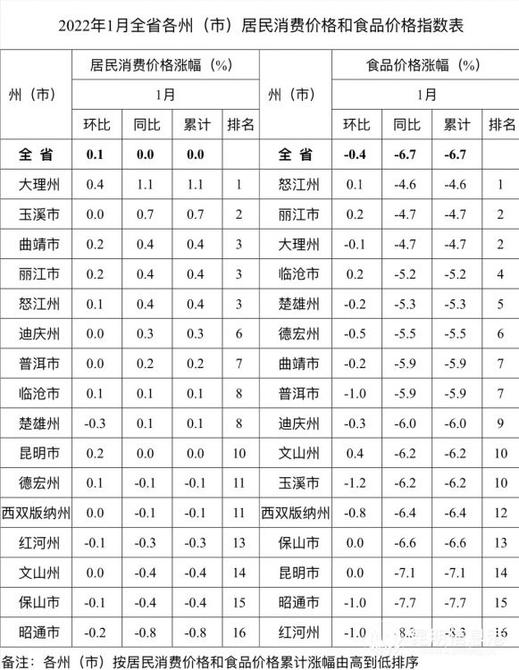 從食品價格看,16個州(市)環(huán)比4升2平10降,其中漲幅較大的是文山州,環(huán)比上漲0.4%,其次是麗江市和臨滄市漲幅均為0.2%;從單月同比看,16個州(市)價格均下降。