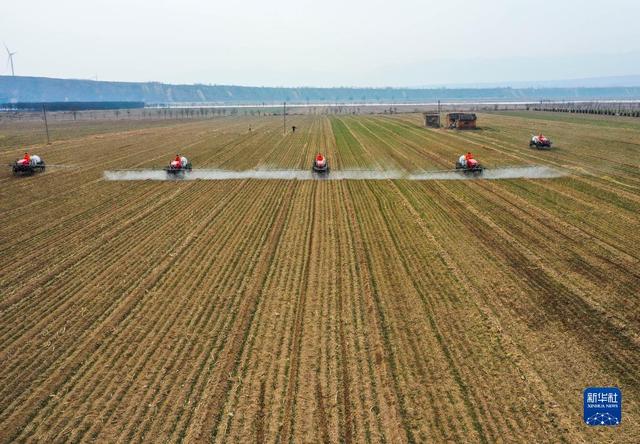 黃河灘地邊,孕育著萬畝麥田,十多輛高地隙植保車齊頭并進,噴灑著葉面肥和植物生長調(diào)節(jié)劑,讓急需營養(yǎng)的小麥苗飽嘗甘霖?!巴赀@個時節(jié),老百姓只需要打除草劑,今年得多打兩次肥料?!鄙轿魇∵\城市芮城縣農(nóng)機手孫亞新說。