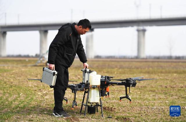 2月17日,在河南省安陽市湯陰縣伏道鎮(zhèn),農(nóng)技人員為植保無人機更換電池。新華社記者 張浩然 攝