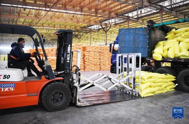 2月17日,工人在位于河南省安陽市湯陰縣伏道鎮(zhèn)的河南萬莊安陽物流園裝運儲備化肥。新華社記者 張浩然 攝