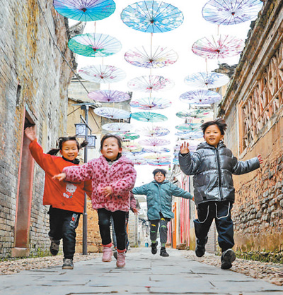 江西省吉水縣白沙鎮(zhèn),孩童在巷道中玩耍。廖 敏攝(人民視覺)