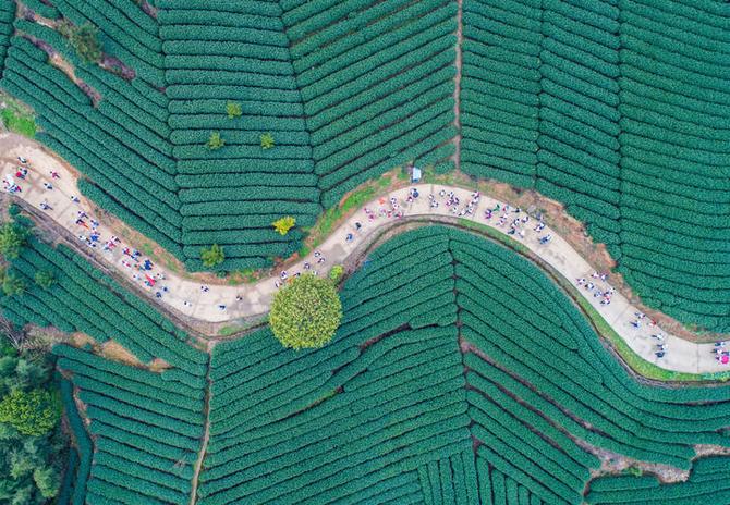 團隊游客在杭州市富陽區(qū)拔山村萬畝茶山游覽(2018年3月26日攝,無人機照片)。浙江省“千村示范、萬村整治”工程撬動了鄉(xiāng)村從美麗生態(tài)到美麗經(jīng)濟,再到美好生活的良性循環(huán)。2018年,浙江“千萬工程”獲得聯(lián)合國“地球衛(wèi)士獎”中的“激勵與行動獎”。新華社記者 徐昱 攝