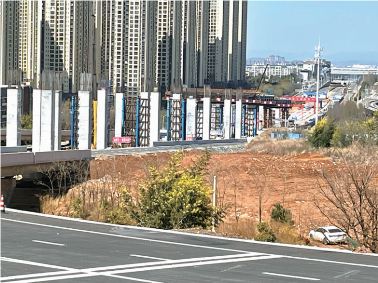 從呈貢42號路望向昆明南站,福宜高速的墩柱已立起來。圖自都市時報客戶端