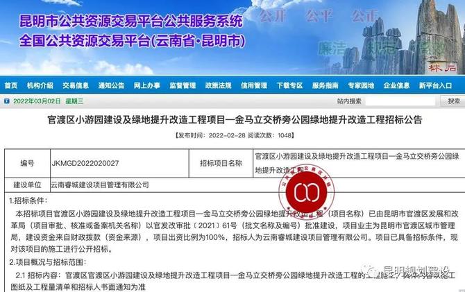 3月2日,昆明市公共資源交易平臺發(fā)布《官渡區(qū)小游園建設(shè)及綠地提升改造工程項目—金馬立交橋旁公園綠地提升改造工程招標(biāo)公告》。