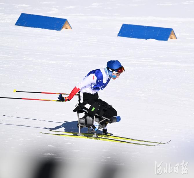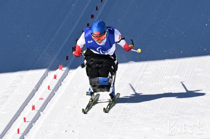 2022年3月5日,中國選手單怡霖在比賽中。當(dāng)日,北京2022年冬殘奧會(huì)殘奧冬季兩項(xiàng)女子短距離(坐姿)比賽在國家冬季兩項(xiàng)中心舉行。中國選手單怡霖獲得亞軍。河北日?qǐng)?bào)記者 賈恒 攝