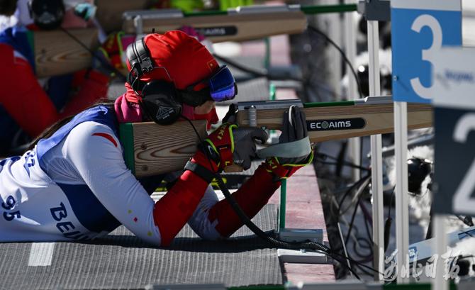 2022年3月5日,中國選手王躍在比賽中射擊。當(dāng)日,北京2022年冬殘奧會(huì)殘奧冬季兩項(xiàng)女子短距離(視障)比賽在國家冬季兩項(xiàng)中心舉行。中國選手王躍獲得第4名。河北日?qǐng)?bào)記者 賈恒 攝