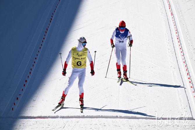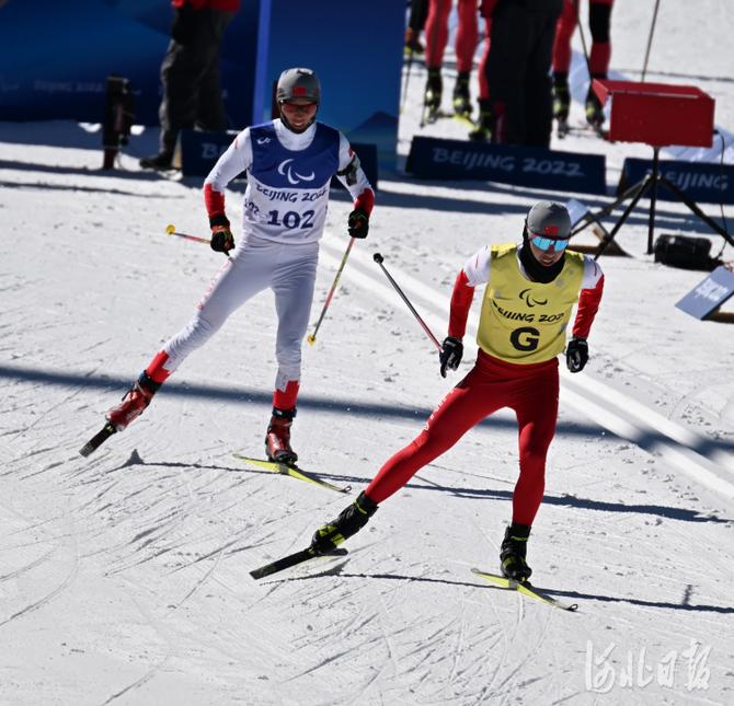 2022年3月5日,中國選手黨鶴松(左)和引導(dǎo)員秦海洋在比賽中。當(dāng)日,北京2022年冬殘奧會(huì)殘奧冬季兩項(xiàng)男子短距離(視障)比賽在國家冬季兩項(xiàng)中心舉行。中國選手黨鶴松獲得第8名。河北日?qǐng)?bào)記者 賈恒 攝