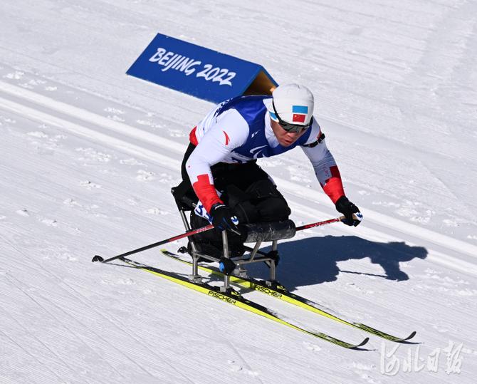 2022年3月5日,中國選手劉夢(mèng)濤在比賽中。當(dāng)日,北京2022年冬殘奧會(huì)殘奧冬季兩項(xiàng)男子短距離(坐姿)比賽在國家冬季兩項(xiàng)中心舉行。中國選手劉夢(mèng)濤獲得銅牌。 河北日?qǐng)?bào)記者 賈恒 攝