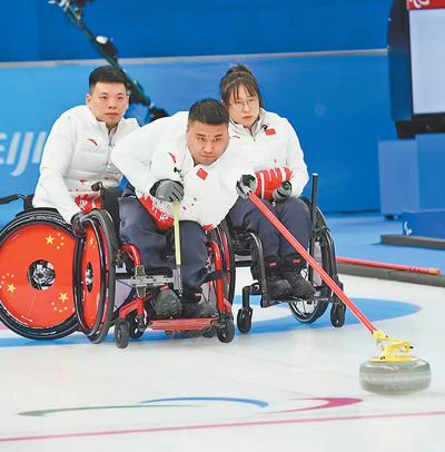 3月6日,中國代表團運動員王海濤(中)在輪椅冰壺循環(huán)賽對陣愛沙尼亞隊的比賽中。