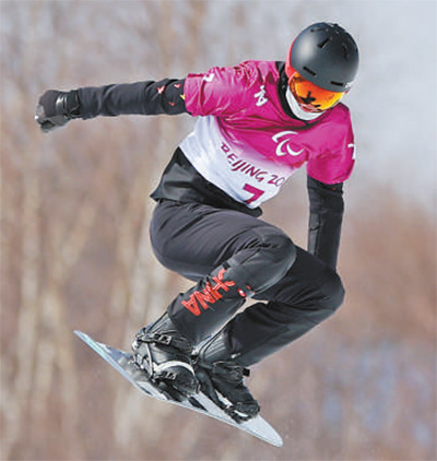 3月6日,中國代表團運動員紀立家在殘奧單板滑雪男子障礙追逐資格賽中。
