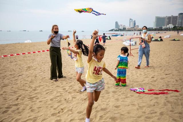 2021年4月9日,兒童在泰國芭堤雅海灘上放風箏。(新華社記者張可任攝)