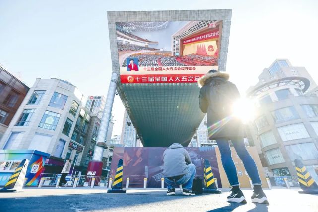 3月5日,北京市民在世貿(mào)天階的戶外大屏上觀看十三屆全國人大五次會議開幕會電視直播。(圖片來源:人民視覺)