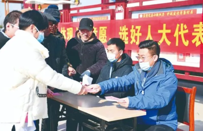 山東省臨沂市郯城縣縣鄉(xiāng)人大代表換屆選舉投票日,工作人員在馬頭鎮(zhèn)馬東選區(qū)投票站發(fā)放“選民證”。(圖片來源:人民視覺)