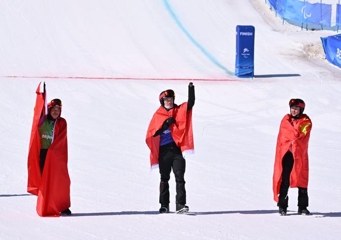 3月7日,北京冬殘奧會單板滑雪男子障礙追逐UL級決賽,獲得冠軍的中國選手紀(jì)立家(中)、獲得亞軍的中國選手王鵬耀(左一)和獲得季軍的中國選手朱永鋼賽后慶祝。新華社記者牟宇攝